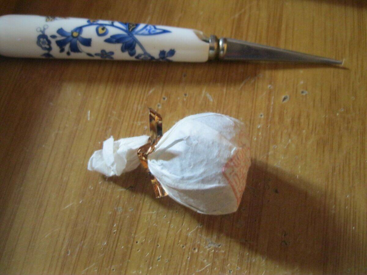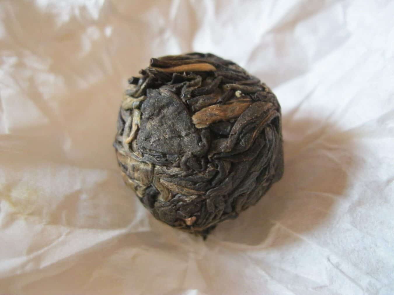 Elegant orchid and jasmine nose.  Elegant sweetness.  This dragon pearl falls decidedly in the genteel class.  Outstanding lingering orchid and boozy huigan that builds in sweetness.  Glassy smooth, no astringency, but there’s a buzzing effect throughout mouth and cheeks.  Starts to intensify considerably by fourth infusion: more rock sugary sweetness.  Next level Mouth activation with salivation and dryness at the same time, reaches throat.  Qi kicks in, heady.  Wooziness afoot and warming in belly.  Long lasting and powerful.  Tea sweats.  Performs best in silver and earthen cup followed by glass then porcelain.  Porcelain smooths over some of the dynamism from the zisha and silver.  Lincang Xigui autumn, hand-rolled, material.  Pinched not plucked leaves, one or two “horse hooves” per pearl.  Square chop.  Stored since Jun ’15.