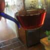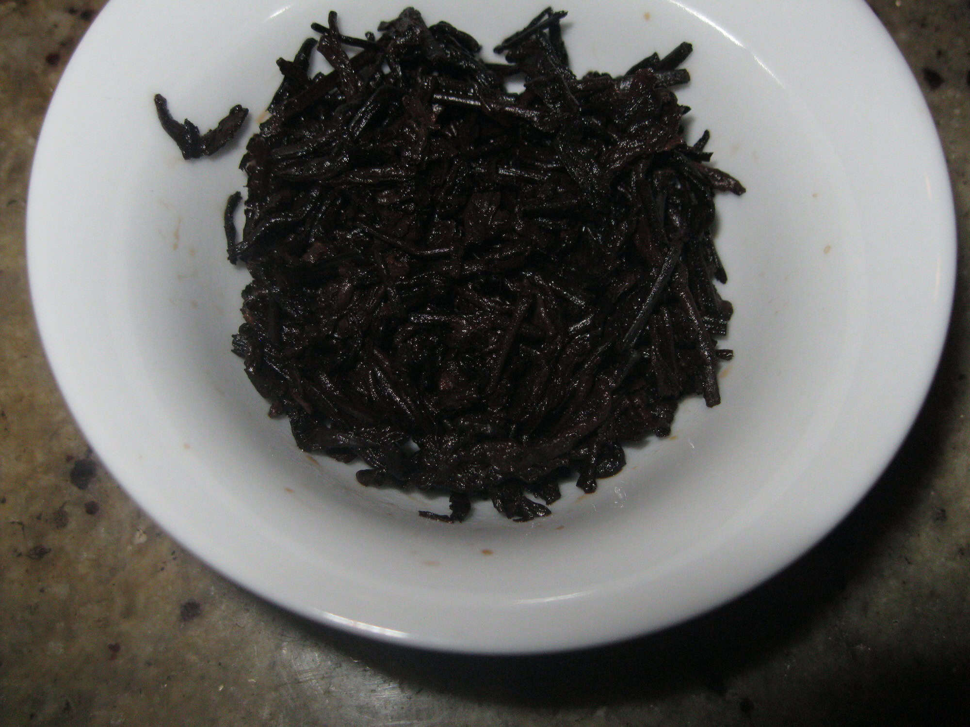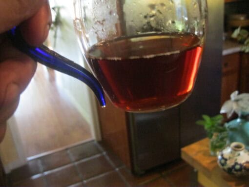 Creamy taste, texture, and nose gives way to unmistakable old‑newspaper bitterness — the classic Bulang chenwei (old taste) that only well‑handled Guangdong humidity can produce. Camphor insinuates itself through the top notes, subtly hinting at its early Guangdong conditioning. The qi lands with authority: warming, expansive, and skin‑tingling. The deep red liquor’s finish lingers with old‑taste newspaper and a touch of baker’s chocolate. The tannins have asserted themselves more over time, reaching into the throat.